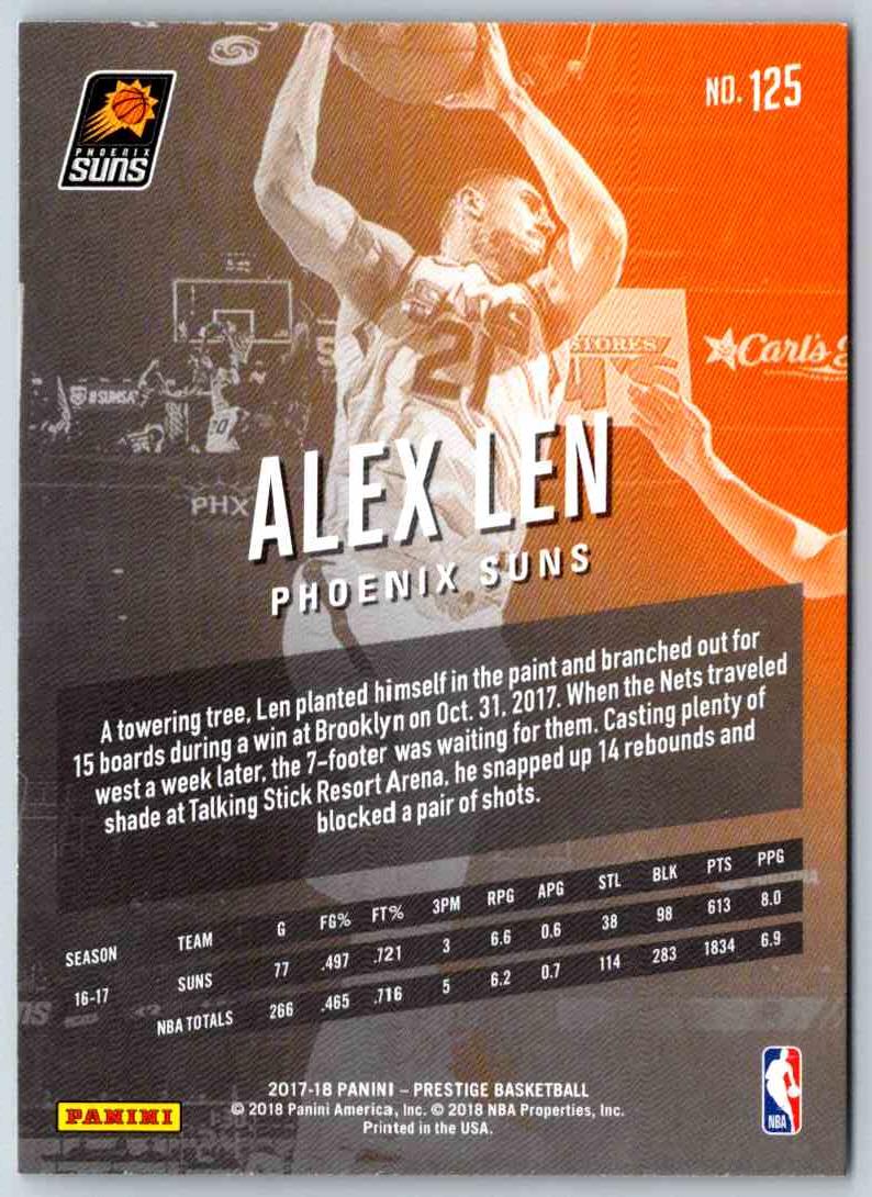 The 2017 Prestige Alex Len #125 is the perfect addition to any basketball fan's collection. This card features a detailed image of Len in his Phoenix Suns uniform, showcasing his athletic ability and strength. On the back of the card, there is a detailed breakdown of Len's stats and accomplishments, making it the ideal choice for collectors and fans alike. The card is printed on high-quality, glossy cardstock, making it a durable and lasting product. With this card, you can be sure to add a valuable piece to your collection.