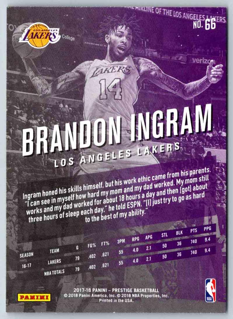 This 2017 Prestige Brandon Ingram #66 card is a must-have for any serious basketball card collector! Featuring Ingram in his Los Angeles Lakers uniform, the card captures him at the peak of his career. The card is also printed on thick card stock and features a glossy finish that adds depth and texture. With vivid colors and a clean design, this card is a great addition to any collection.
