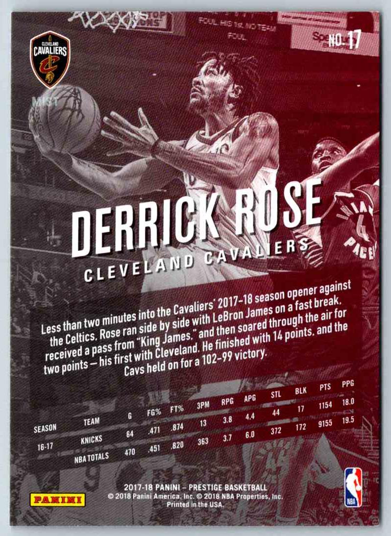 This 2017 Prestige Derrick Rose #17 is a must-have for any basketball fan. This card features a full-color image of Rose in his Chicago Bulls jersey. The card showcases Rose's stats, awards and highlights throughout his career, making it a great collectible item. It also features a unique design that is sure to stand out in any collection. This 2017 Prestige Derrick Rose #17 card is perfect for any Bulls fan and collector alike. Get your hands on this card before it's gone!