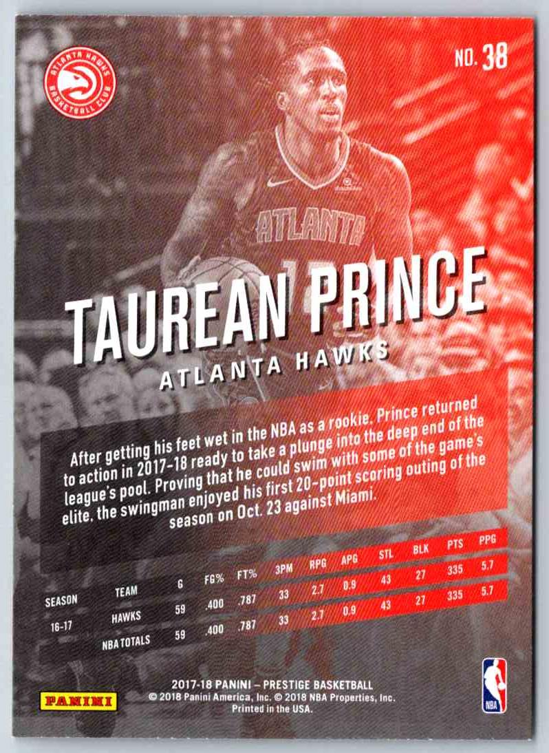 This 2017 Prestige Taurean Prince #38 card is a must-have for basketball card collectors. Featuring a striking black and white image of Taurean Prince on the front, this card is sure to be a standout in any collection. The back of the card showcases a detailed biography of the talented basketball player, plus his vital stats, awards, and career highlights. With high-quality printing and sturdy construction, this card is perfect for any fan of the game. Get your hands on this unique card today!