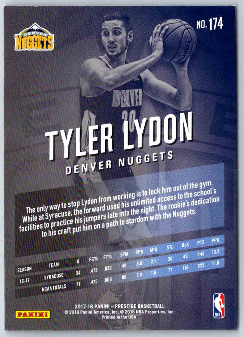 The 2017 Prestige Tyler Lydon #174 card is a must-have for any fan of the Denver Nuggets. This card features a full-color, high quality image of Lydon in his Nuggets uniform, with a detailed biography on the back. It is printed on quality card stock, and is a great way to show your support for the Denver Nuggets and Tyler Lydon. Add this card to your collection today and show your pride for the Nuggets and Lydon!
