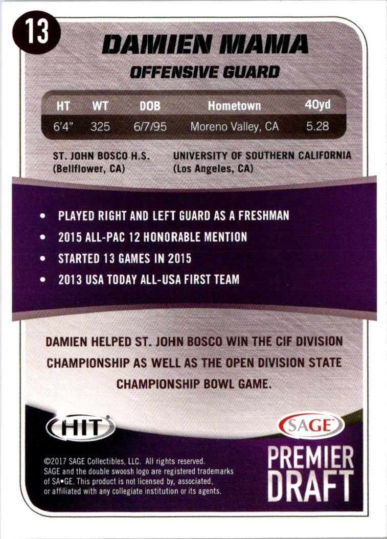 The 2017 SAGE HIT Damien Mama #13USC Trojans is the perfect addition to any memorabilia collection. Featuring a unique card design, this card honors the Trojans' star offensive lineman. It's a great representation of the team and captures Mama's impact on the field in vivid detail. The card is printed on high-quality card stock, and its glossy finish enhances the colors and makes it a great display piece. Add this to your collection and show your support for the Trojans!