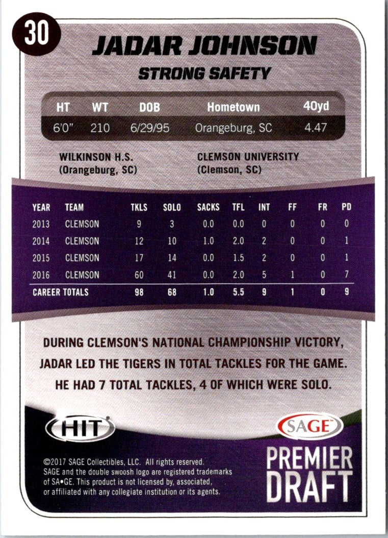 The 2017 SAGE HIT Jadar Johnson #30 Clemson Tigers card is an item that any Clemson Tigers fan has to have in their collection! This card was designed to commemorate the impact that Jadar Johnson had at Clemson, as well as to celebrate his accomplishments as a member of the Tigers. The card features an action shot of Johnson during a game, along with his career stats and a headshot. It also has a hologram that rivals any modern day sports card, and is sure to be the envy of any Clemson fan's collection. Add this card to your collection and show your pride in the Clemson Tigers!