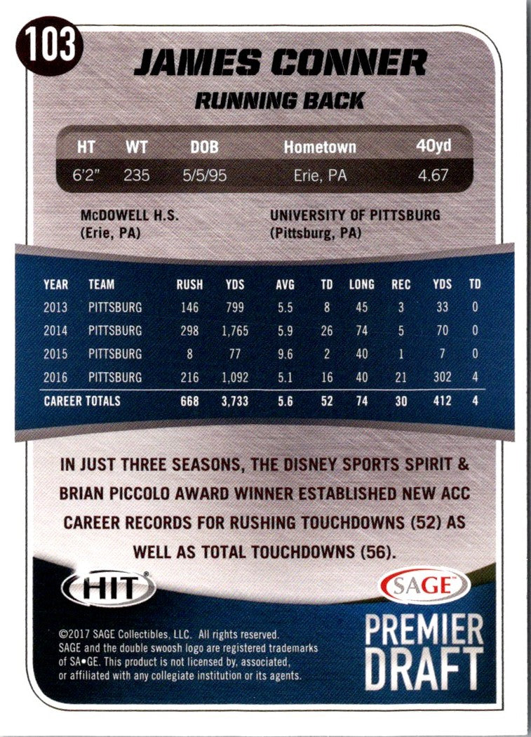 This 2017 SAGE HIT James Conner #103 Pittsburgh Panthers card is a must-have for any Panthers fan. Featuring vibrant colors and a unique design, this card is sure to make a great addition to your collection. The card showcases Conner in a detailed full-body action shot, as he looks to make a big play. This card is a great way to commemorate one of the Panthers' all-time greats. Add it to your collection today and show your Panthers pride!