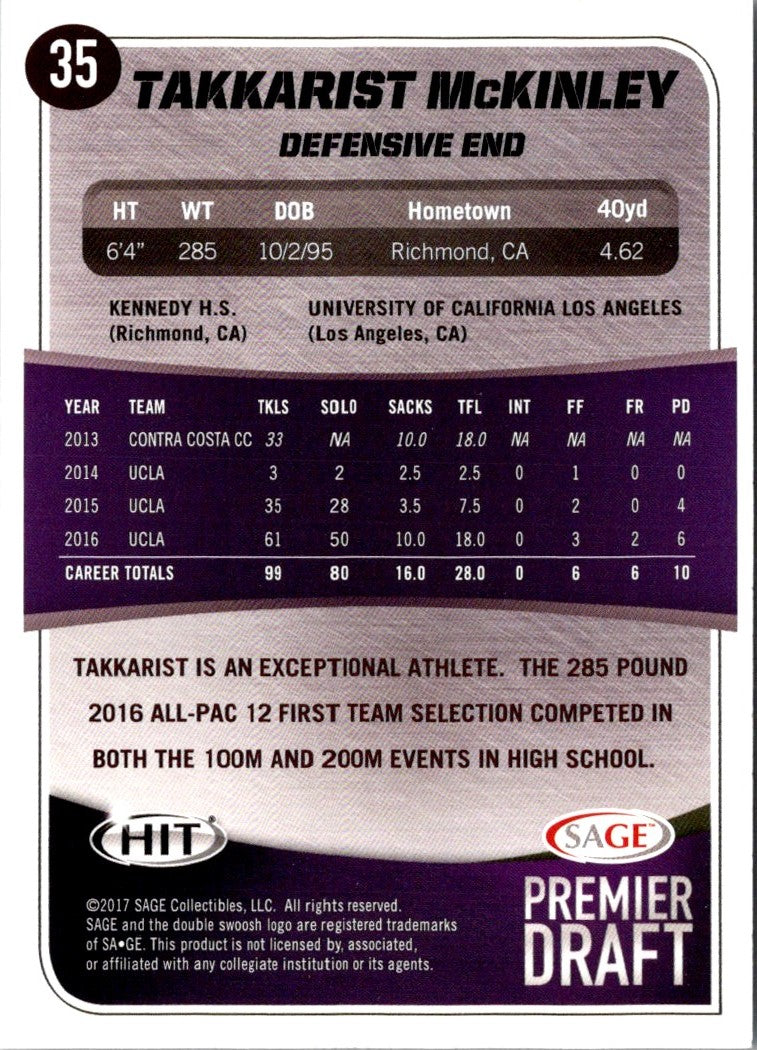 The 2017 SAGE HIT Takkarist Mckinley #35 UCLA Bruins has all the makings of a collectible item. The card features a full-color action shot of Takkarist in his Bruins uniform, along with detailed stats and background information. This card is an excellent addition to any collection, for the fan or collector alike. The card is also made from high-quality card stock with a glossy finish, ensuring it will stand the test of time. It's a must-have for any UCLA fan, and a great way to add to your collection.
