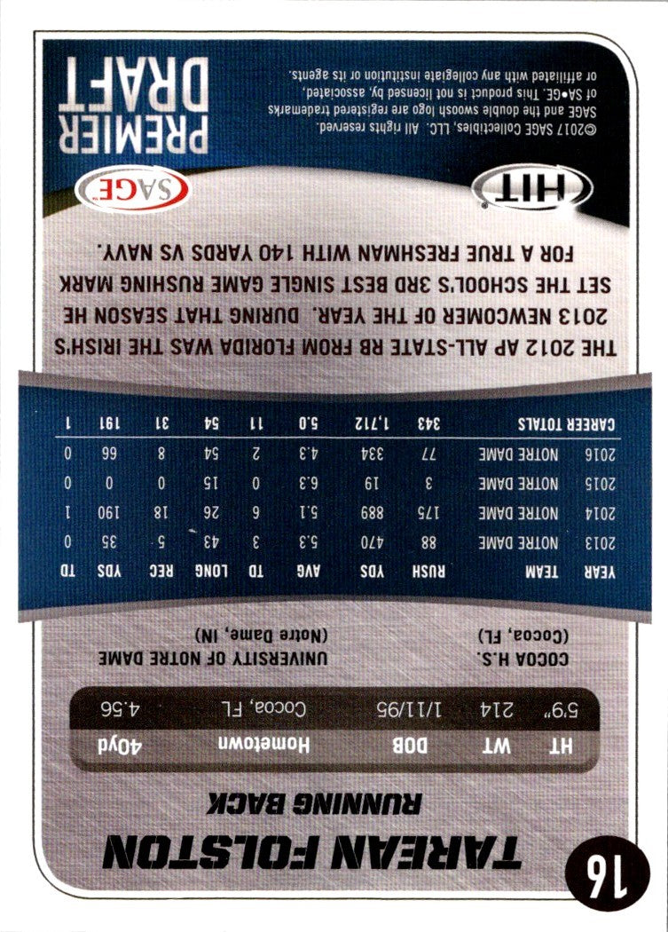 The 2017 SAGE HIT Tarean Folston #16 Notre Dame Fighting Irish is an essential item for any Fighting Irish fan. This card features a vibrant action photo of Folston in his Fighting Irish uniform. The card is made of high quality materials and has been professionally designed to ensure it'll look great in any collection. The card also features a detailed biography on Folston, giving you all the information you need to know about this talented running back. Whether you're looking for an addition to your own collection or the perfect gift for a Notre Dame fan, the 2017 SAGE HIT Tarean Folston #16 Notre Dame Fighting Irish is sure to please.