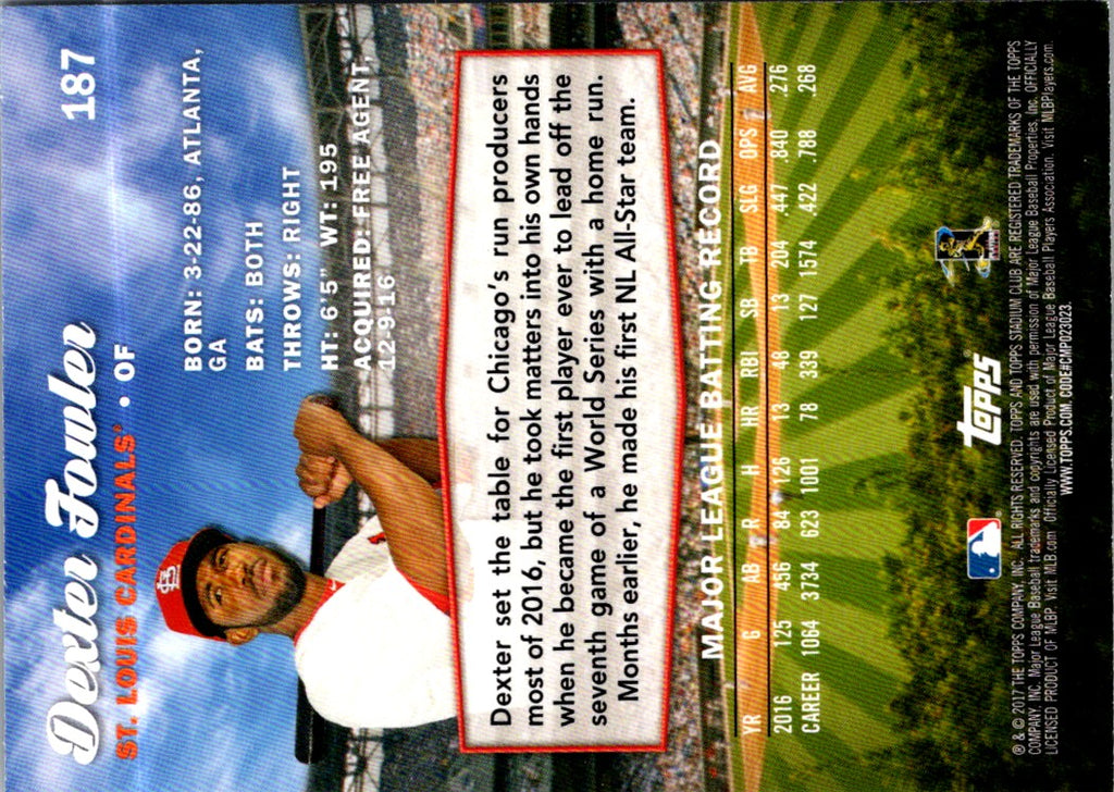 The 2017 Stadium Club Dexter Fowler #187 St. Louis Cardinals card is a must-have for any Cardinals fan! Featuring an amazing action shot of Dexter Fowler in center field, this card captures the intensity of the game. The card is printed on durable cardstock and features vibrant colors and detailed graphics. Fans of the Cardinals will love having this card in their collection. It's a great way to show your support for the team and your favorite players. Get your 2017 Stadium Club Dexter Fowler #187 St. Louis Cardinals card today!