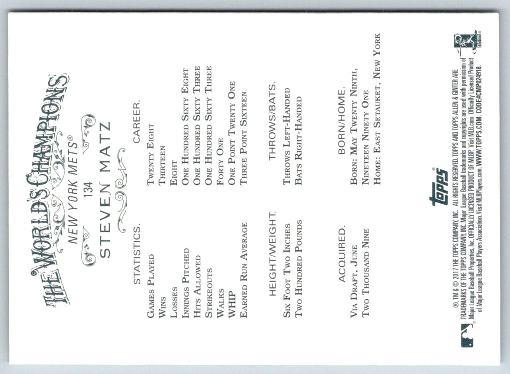 The 2017 Topps Allen & Ginter Hot Box Foil Steven Matz #134New York Mets card is a must-have for any fan of the Mets or Steven Matz. With vibrant colors and a detailed portrait, this card will make a great addition to any collection. It also features a unique design that is sure to draw attention and make a statement. The card is also printed on durable cardstock and is perfect for display or protection. Don't miss out on this incredible card! Add it to your collection today.