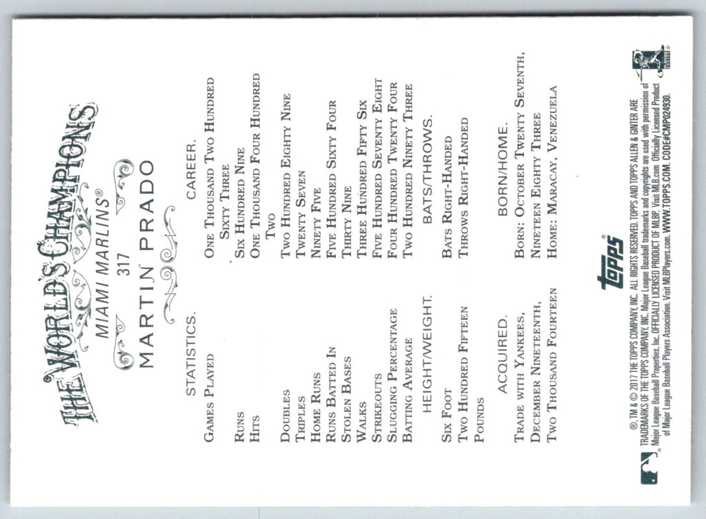 Add a valuable piece to your collection with this 2017 Topps Allen & Ginter Martin Prado #317 Miami Marlins card. This card celebrates the all-star career of Martin Prado, who has been an exciting and dependable infielder for the Marlins since 2011. It features a classic full-body portrait of Prado in his Marlins uniform, along with his career stats printed on the back. Whether you’re a die-hard Marlins fan or a devoted collector, this card is a must-have.
