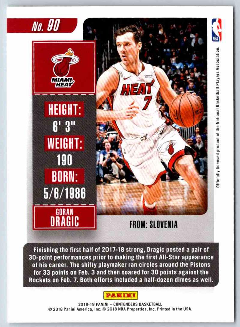 Goran Dragic has been one of the most talented and hardworking players in the NBA for years, and this 2018 Contenders card is a testament to his greatness. This card captures the Miami Heat point guard in mid-action, showing off his lightning-quick speed and driving ability. It also features Dragic's jersey number "90" on the front, along with the Miami Heat logo and Contenders logo. This card is sure to be a great addition to any basketball fan's collection and a great way to honor a true NBA superstar.