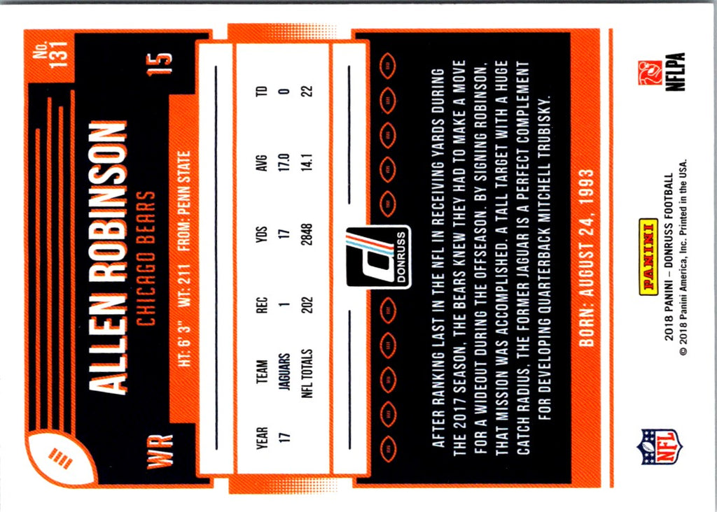 This 2018 Donruss Allen Robinson #131Chicago Bears card shows off the power and athleticism of the Bears' star wide receiver. With his signature style of play, Robinson makes plays all over the field, and this card captures it all. Featuring Robinson in his white Bears uniform and catching a pass, this card is sure to be the centerpiece of any collection. From the sharp corners to the crisp images, this card is a must-have for any Bears fan. Add it to your collection today and show your support for one of the NFL's best!