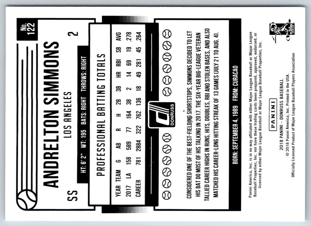 The 2018 Donruss Andrelton Simmons #122 Los Angeles Angels card is a must-have for any Angels fan! This card features an action shot of Simmons in his signature Angels uniform, showcasing the shortstop's impressive field skills. It also features his name and team logo, making it the perfect addition to any baseball card collection. With its stunning full-color design and excellent quality, this card is sure to be a hit with collectors. Add this card to your collection today and show your love for the Los Angeles Angels!