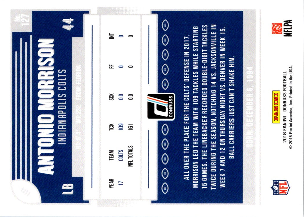 This 2018 Donruss Antonio Morrison card from the Indianapolis Colts is a great addition to any football fan's collection! Featuring a colorful image of the linebacker in full uniform, this card captures his strength and determination. With vibrant colors and a glossy finish, this card has been designed to last and will look great displayed in any collection. Show your support for the Indianapolis Colts and add this card to your collection today!
