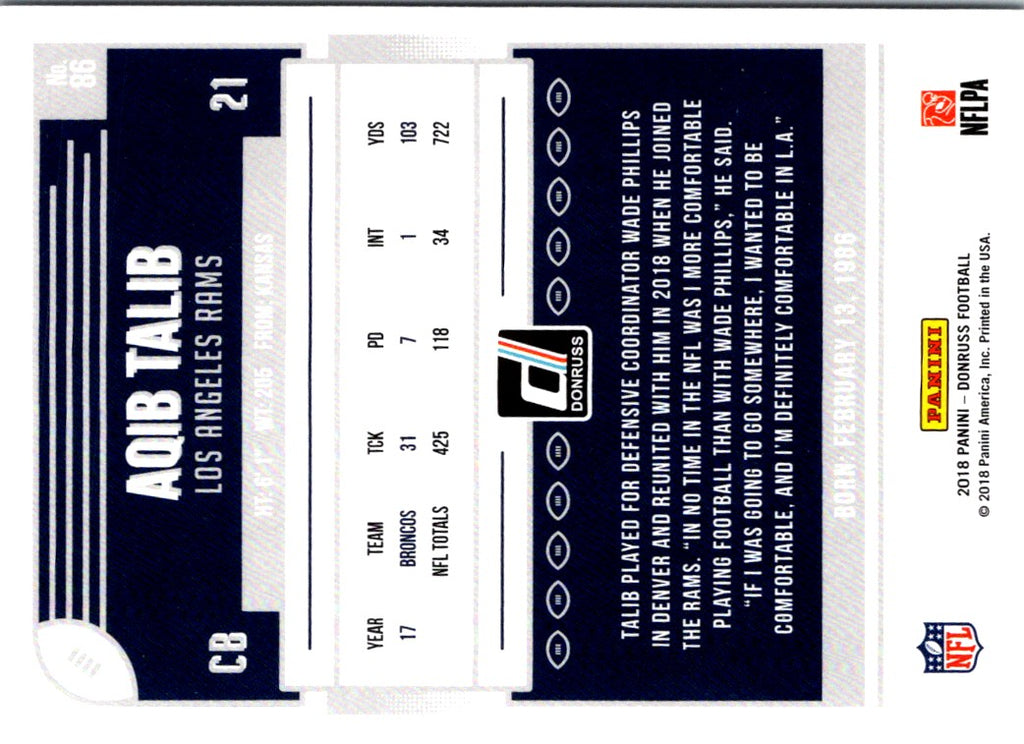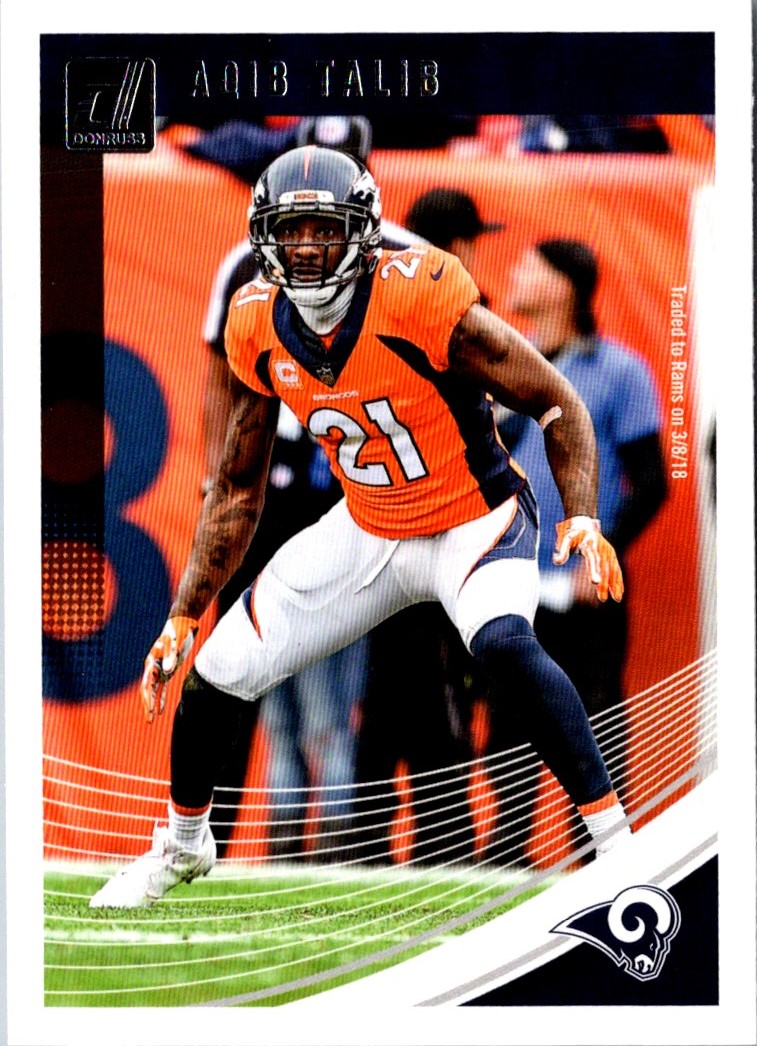 The 2018 Donruss Aqib Talib #86 Los Angeles Rams card is a must-have for any Rams fan. Featuring a bold and captivating image of the star cornerback, it captures Talib in mid-action on the field and is sure to look great in any collection. With vibrant colors and sharp details, this card is a testament to the skill and determination of one of the NFL's greatest defensive players. Don't miss your chance to add this card to your collection - it's a great way to honor a legendary player!