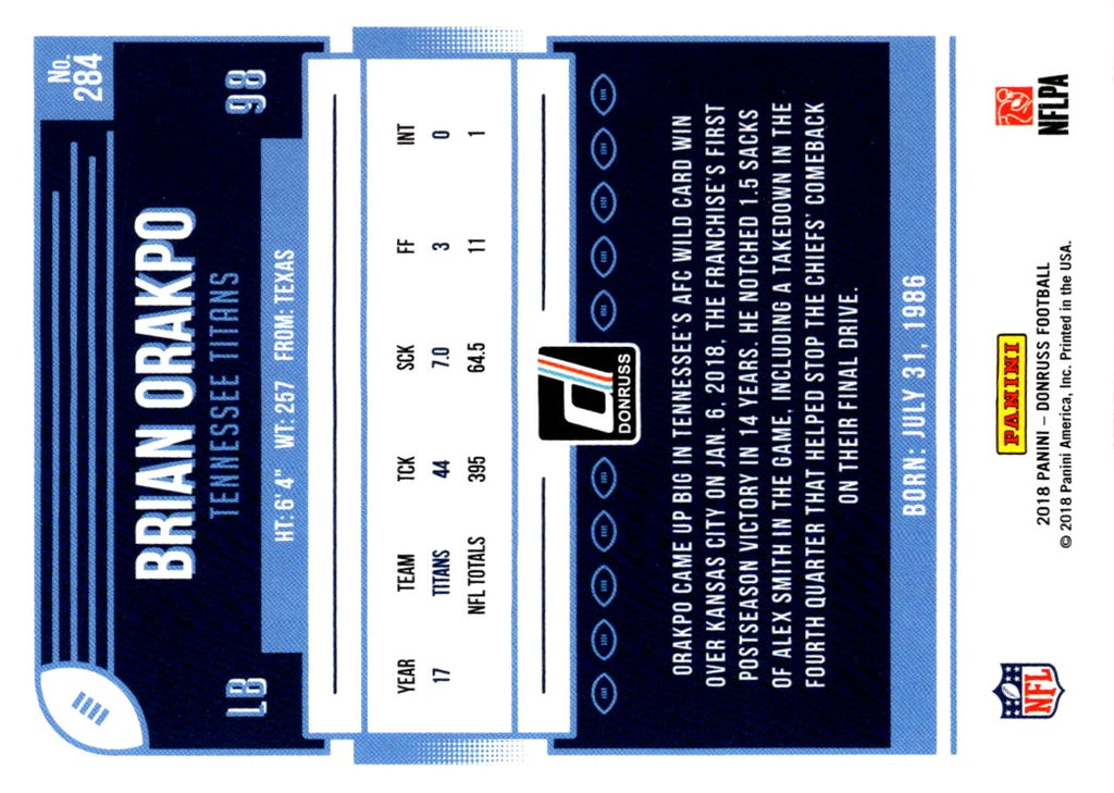 This 2018 Donruss Brian Orakpo card is an absolute must-have for Tennessee Titans fans! Featuring an action shot of the star linebacker, this card captures Orakpo in his classic pose—making a play on the field. This card is sure to become a staple in any Titans fan's collection, and will make a great addition to any football card enthusiast's collection. Show off your Titan's pride with this amazing card!