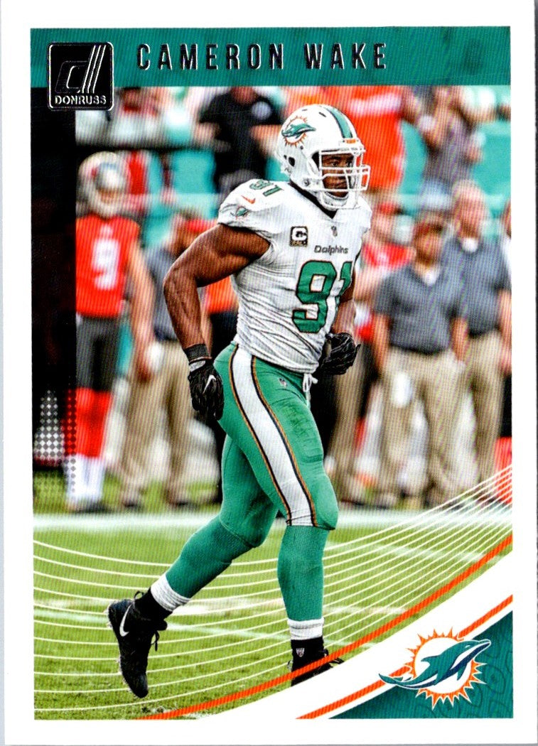 This 2018 Donruss Cameron Wake #170 card is a must-have for fans of the Miami Dolphins! Show off your team pride and admiration for this Pro Bowl defensive lineman with this card. It features an up-close action shot of Wake and is printed on sturdy card stock. It is double-sided, with an image of Wake on the back, and is perfect for any collection. Add this card to your collection today, and show your support for one of the NFL's top defensive players!
