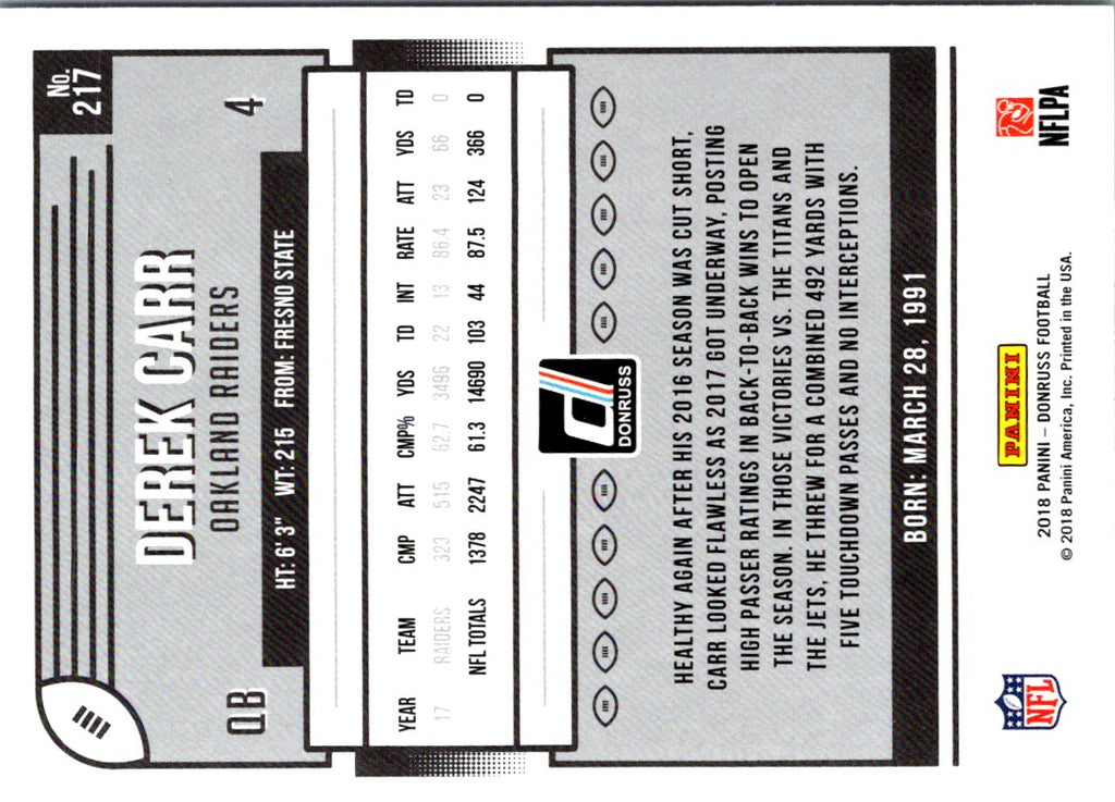 The 2018 Donruss Derek Carr card is the ideal item for any Oakland Raiders fan. This card features a full-color action shot of Carr, along with his name and team across the top. The card also features a stats section with Carr’s career stats and accomplishments. The card is printed on premium cardstock and is a great addition to any Raiders fan's collection. Show your support for Derek Carr and the Raiders with this card.