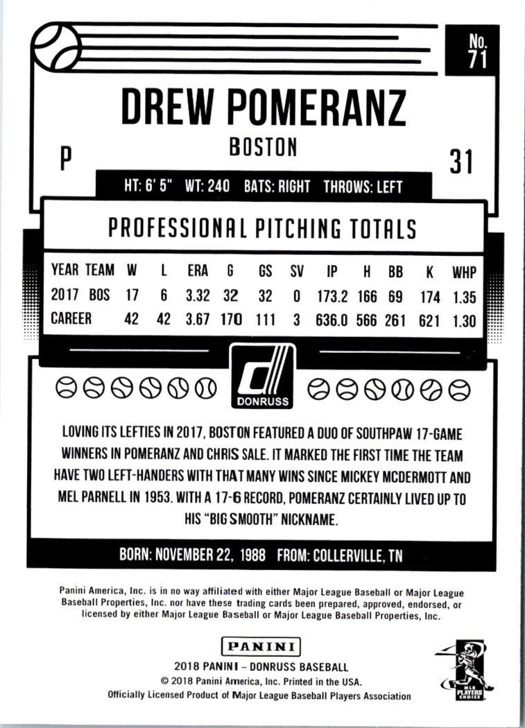 This 2018 Donruss Drew Pomeranz #71 Boston Red Sox card is the perfect way for any fan of the Red Sox to show their team pride. This card features a full-color photo of Drew Pomeranz in action on the mound, complete with detailed stats and team logo on the back. Show your support for the Red Sox with this one-of-a-kind trading card!