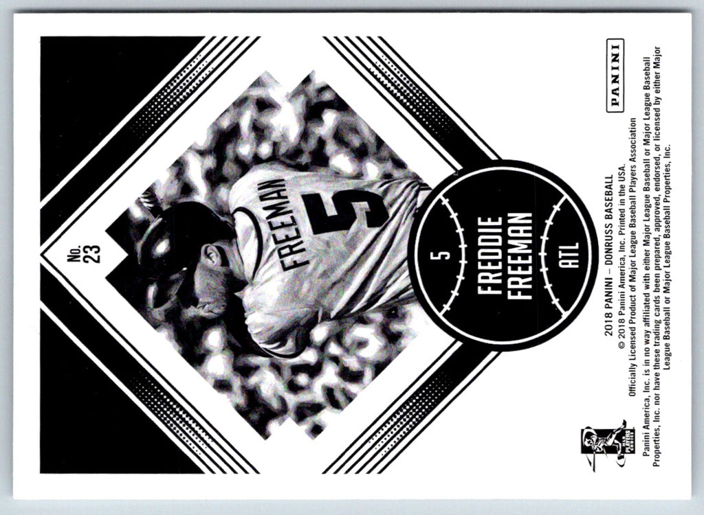 This 2018 Donruss Freddie Freeman #23 Atlanta Braves card is the perfect addition to any Braves fan's collection. Featuring an iconic portrait of the star slugger, this card captures his signature stance and solid batting form. The action-packed background of Turner Field gives it an extra dimension of realism. A must-have for any Freeman fan, this card is sure to become an instant classic.