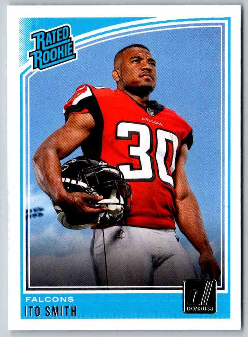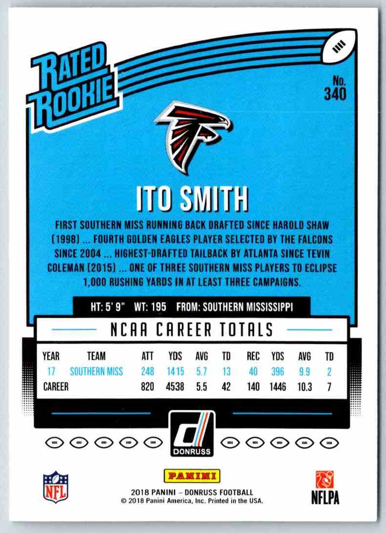 This 2018 Donruss Ito Smith #340 card is a must-have for any collector. Showcasing Smith in action, it also features a full-color portrait on the front and detailed stats on the back. This card is sure to be a great addition to any collection. It is in mint condition and will be the perfect way to commemorate Smith's 2018 season. Show your support for the NFL with this awesome card!