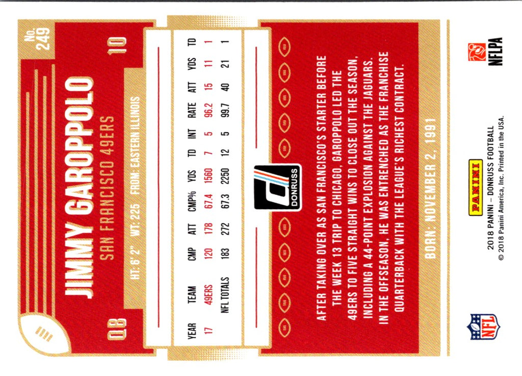 This 2018 Donruss Jimmy Garoppolo #249 card is a must-have for any San Francisco 49ers fan! Show your support for the team and its star quarterback with this collectible card. Featuring Jimmy Garoppolo throwing a pass, this card is sure to make a great addition to any collection. The card displays great detail, showcasing the star quarterback in action. Get your hands on this card and show your love for the 49ers and Jimmy Garoppolo!