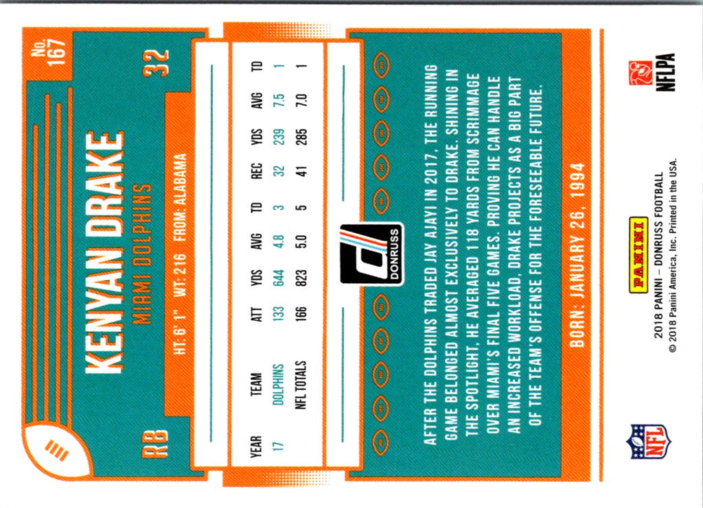Show off your Miami Dolphins pride with the 2018 Donruss Kenyan Drake #167 card. This card features a sleek design with a glossy finish, showcasing Drake in a Miami Dolphins uniform. The card also includes Drake's vital stats, such as his height, weight, and position. This card is an essential for any Miami Dolphins fan and makes a great addition to any collection. Whether you're a diehard fan or a casual collector, this card is sure to make a great addition to your collection. Get your hands on the 2018 Donruss Kenyan Drake #167 card today!