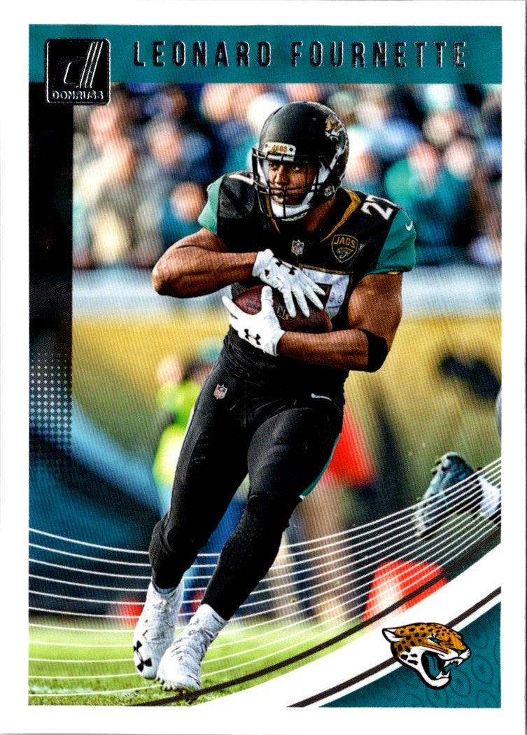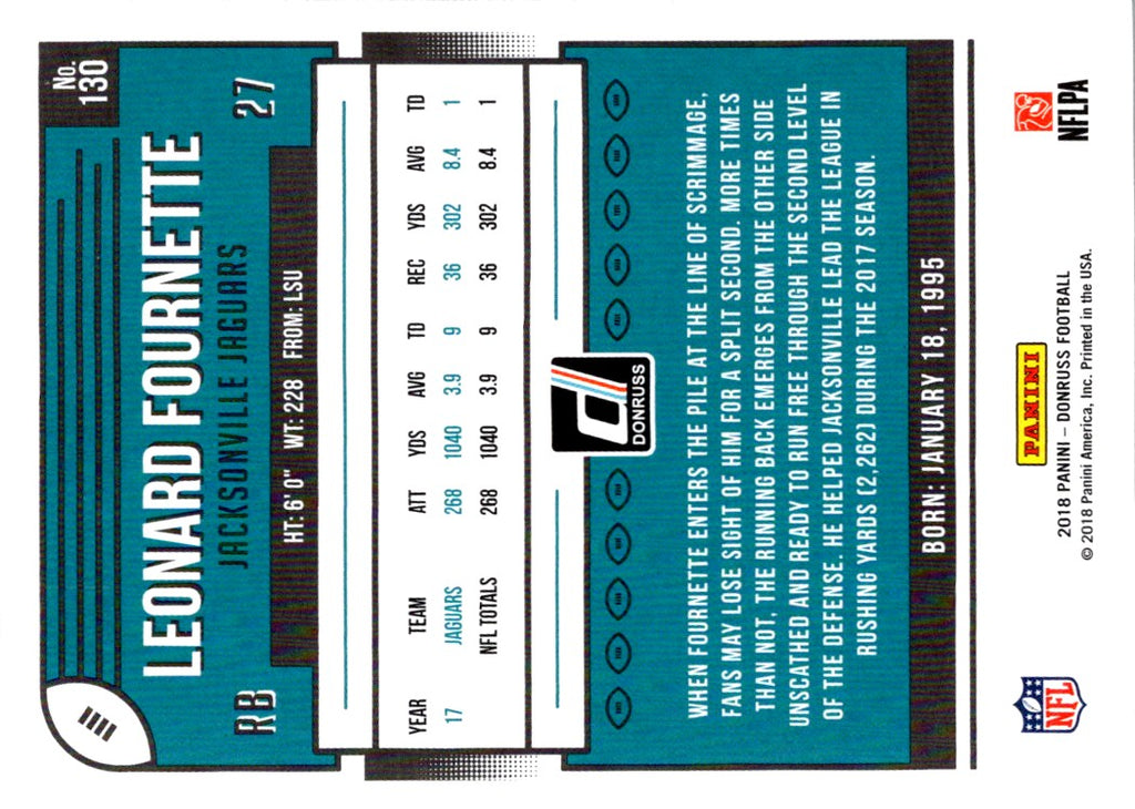 This 2018 Donruss Leonard Fournette #130 is a must-have for any Jacksonville Jaguars fan! Featuring a vibrant full-color image of the star running back, this card is a great way to commemorate Fournette's accomplishments on the field. The back of the card provides an in-depth look at his career stats and accomplishments, making it a great collectible for any fan. Add this card to your collection today and show your support for the Jacksonville Jaguars!