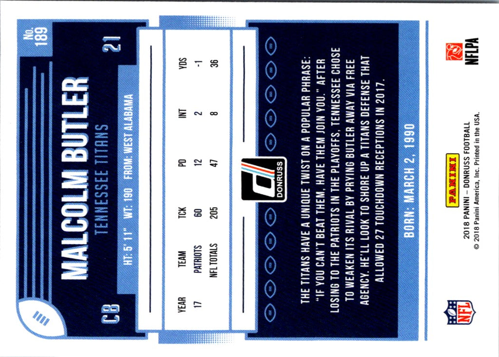 This 2018 Donruss Malcolm Butler #189 card celebrates the Tennessee Titans cornerback's stellar NFL career. Butler is best known for his game-winning interception in Super Bowl XLIX, which sealed the title for the New England Patriots. The card showcases a full-color image of Butler in his Titans uniform, along with his career stats and highlights. This card is a must-have for any serious collector of NFL memorabilia and a great way to commemorate Butler's success.