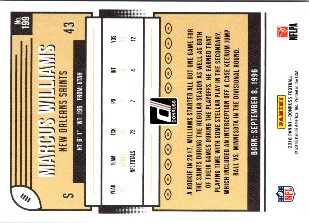 This 2018 Donruss Marcus Williams #199 card celebrates the incredible performance of the New Orleans Saints safety. Williams has been a key part of the Saints defense since he was drafted in 2017 and is quickly becoming one of the best defensive players in the league. This card features a full-color action photo of Williams in his Saints uniform on the front. The back of the card includes detailed stats, bio and career highlights of the player. Add this special card to your collection and honor the best of the Saints defense.
