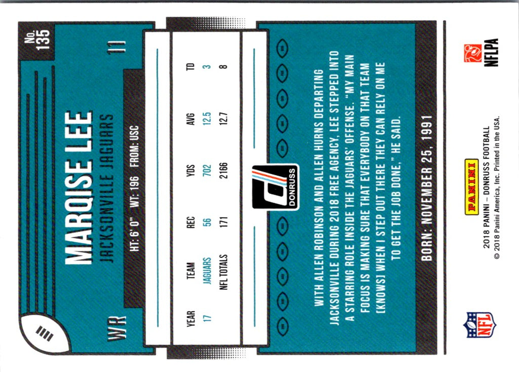 Marqise Lee is the star wide receiver for the Jacksonville Jaguars. He's made a name for himself with his sure hands and ability to make the tough catch. The 2018 Donruss Marqise Lee card commemorates the star receiver's accomplishments with a brilliant full-color portrait and intricate design elements. It's a must-have for any Jaguars fan or football card collector. Add it to your collection and show your support for Marqise Lee and the Jacksonville Jaguars.