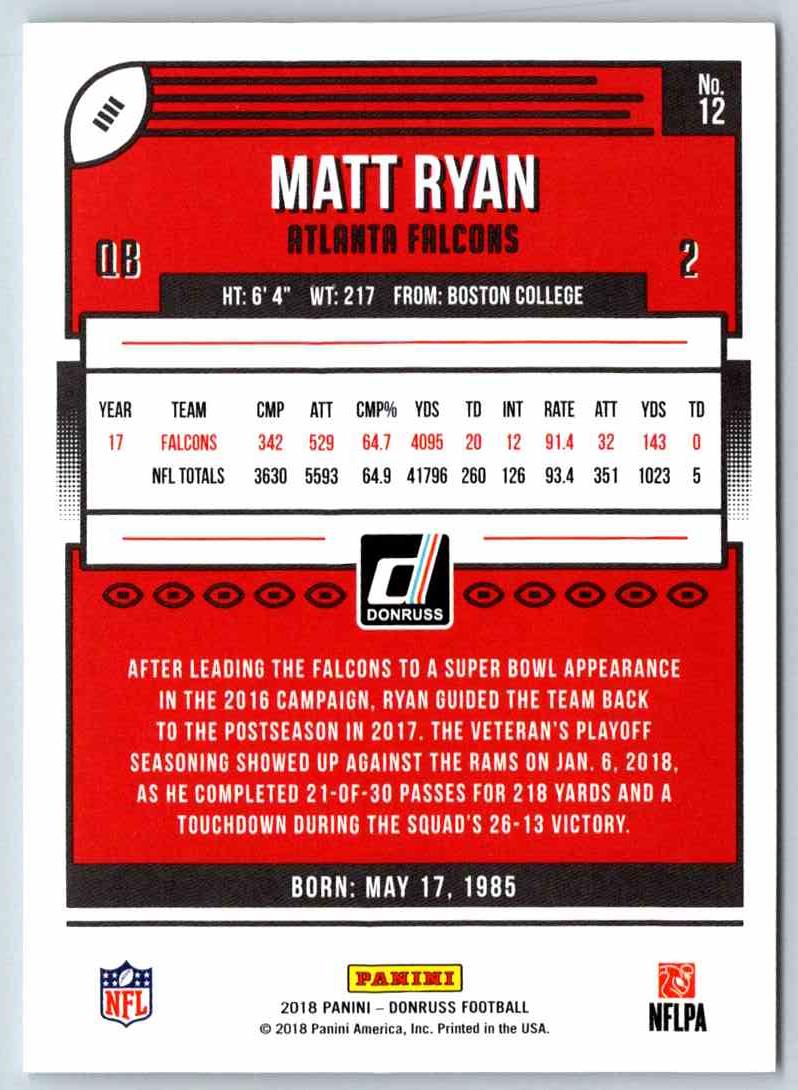 The 2018 Donruss Matt Ryan #12 is a must-have for any Atlanta Falcons fan! This card features a sharp, high-resolution image of Ryan, and the accompanying stats listed on the back make this card a great collectible. Perfect for any sports memorabilia collector, this card is sure to be a great addition to your collection.