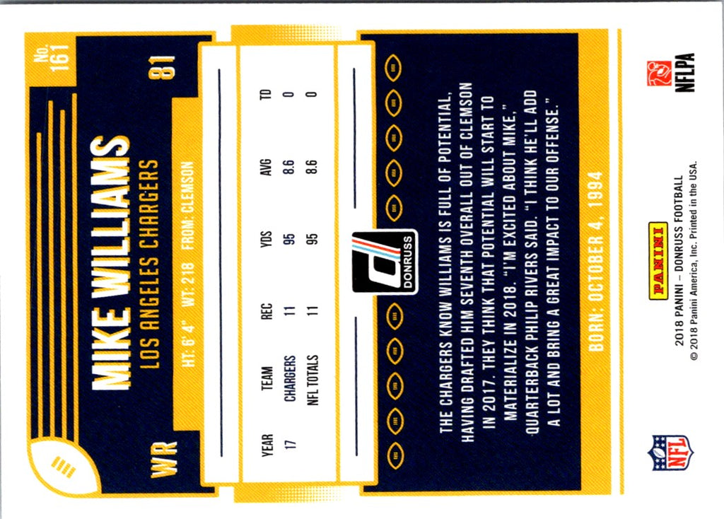 This 2018 Donruss Mike Williams card celebrates the Los Angeles Chargers wide receiver and features a full-color action shot of him in his home uniform. The card is perfect for any Chargers fan or collector, and has a great design that will make it stand out in any collection. The card is printed on glossy stock for an extra touch of quality, and is sure to become a must-have for any fan. Add this Mike Williams card to your collection today and celebrate one of the up-and-coming stars of the NFL.