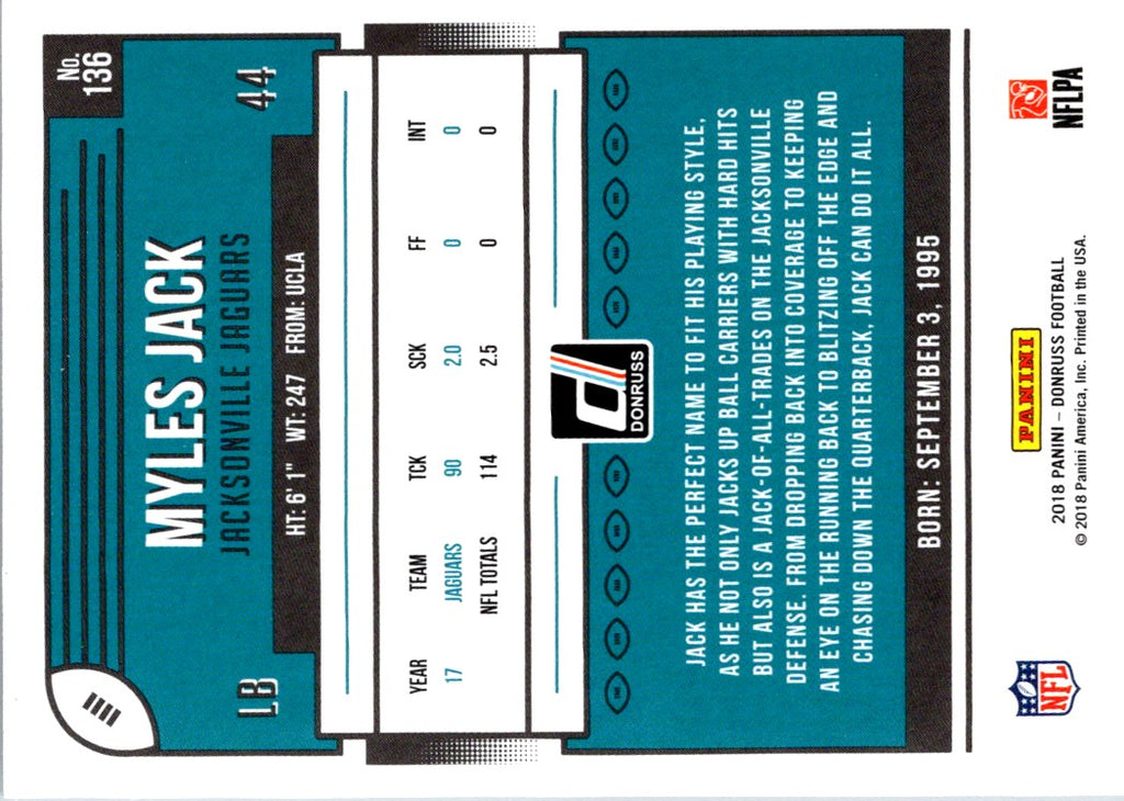 This 2018 Donruss Myles Jack #136 card is a must-have for any Jacksonville Jaguars fan! Featuring a full-color image of the linebacker in action, this card celebrates his talent and shows off his athleticism. The card is printed on premium card stock and features a glossy finish that helps to highlight the vibrant colors. The back of the card includes a detailed biography of the player along with his team and league stats. This is a great way to show your support for the Jaguars and to honor the skill and dedication of Myles Jack. Add this card to your collection today!