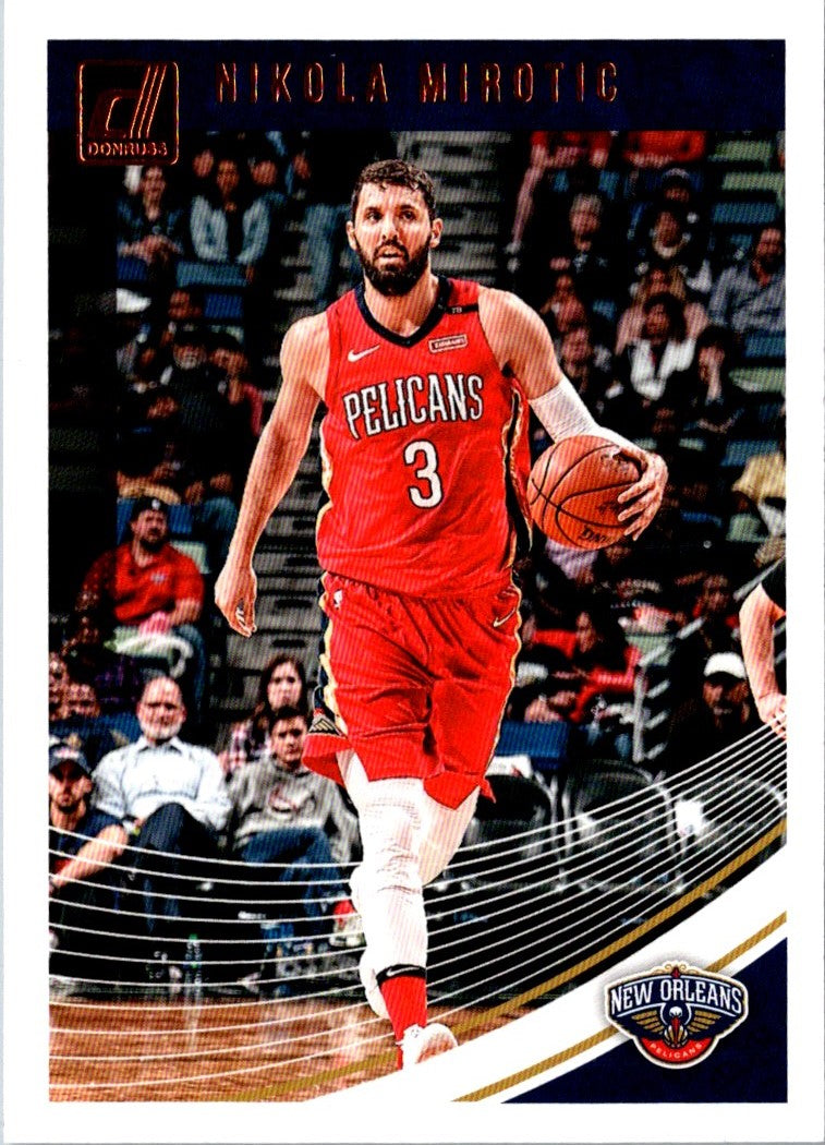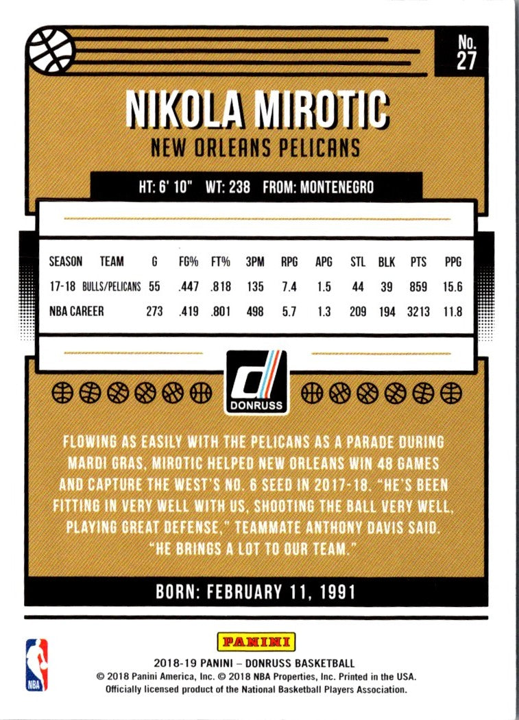 This 2018 Donruss Nikola Mirotic card celebrates the forward's first season with the New Orleans Pelicans. The card features a sharp image of Nikola in game action and a vibrant design. With the card, you can commemorate Nikola's impressive stats while he was with the Pelicans and his impact on the team. This card is a great addition to any Pelicans fan's collection and a great way to honor the versatile forward.