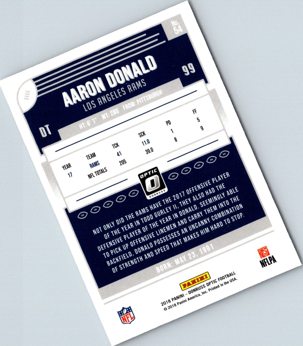 This 2018 Donruss Optic Aaron Donald #54 Los Angeles Rams card is a must-have for any football fan. Featuring a vibrant image of the Rams' star defensive tackle, it is a great way to show your team spirit. Every card is printed on a thick card stock and is protected by a glossy finish. It also features a bright and bold design with a unique design that stands out. With a limited print run, this card is sure to be a great addition to any collection. Get yours today and let everyone know you support the Rams!