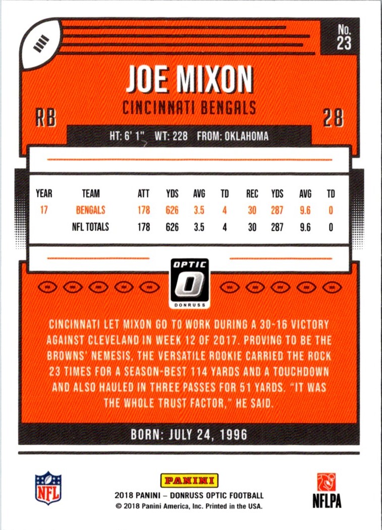 This 2018 Donruss Optic Joe Mixon #23 Cincinnati Bengals card features a vibrant image of the Bengals running back. This card is the perfect addition to any collection and will make a great gift for any Bengals fan. It shows off Mixon’s outstanding skills on the field and his dedication to the team. The card is printed on high-quality paper and is sure to stand out in your collection. Get your hands on this card and celebrate one of the greatest players in Bengals history.