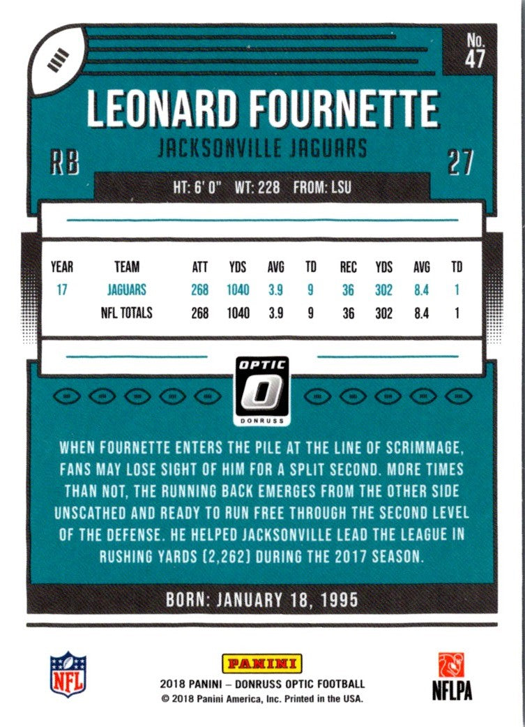 This 2018 Donruss Optic Leonard Fournette #47 Jacksonville Jaguars card is a must-have for any football fan or collector. Featuring the star running back of the Jaguars, this card captures Fournette in action on the gridiron, highlighted by vibrant colors and a sleek design. Whether you are a fan of Fournette, the Jaguars, or just football, this card is the perfect addition to your collection.