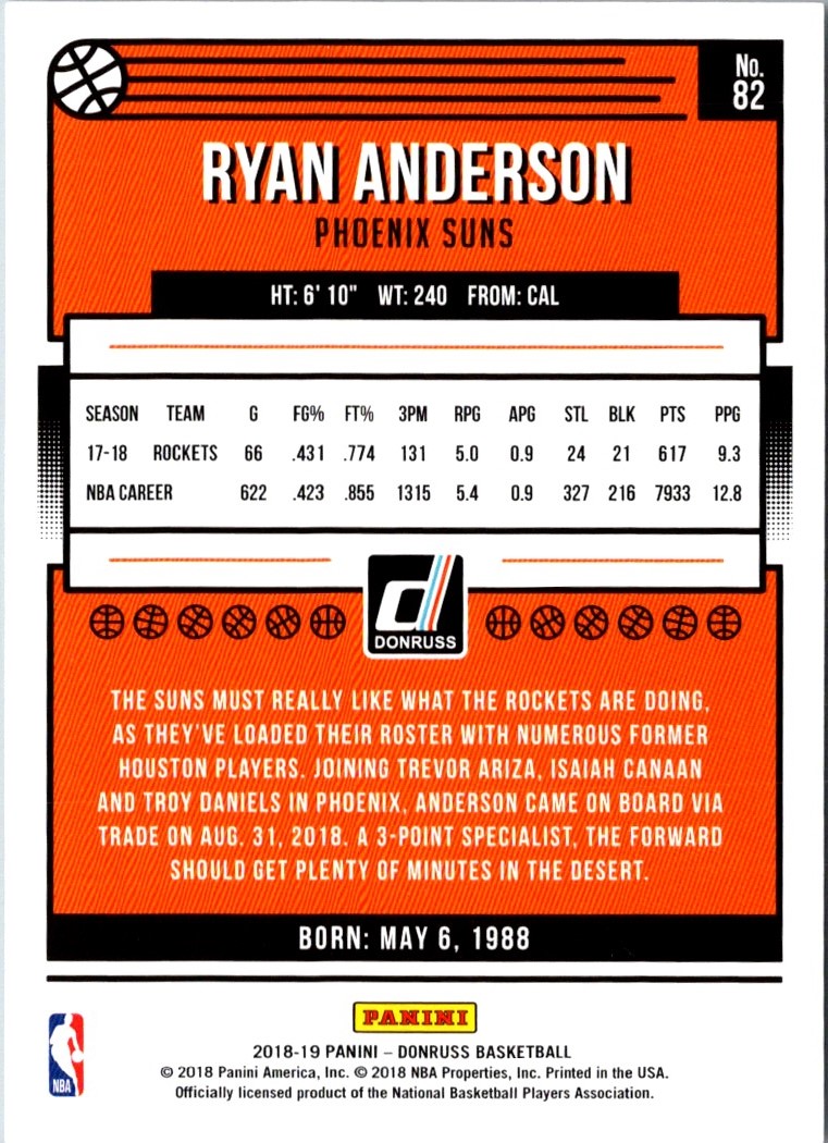 Get your hands on the 2018 Donruss Ryan Anderson #82 Phoenix Suns card today! This card is perfect for any basketball fan or collector, showcasing the athleticism and skill of Ryan Anderson. The card features a high-quality image of Ryan on the front and his stats and career highlights on the back. With its vibrant colors and bold design, this card is sure to make an eye-catching addition to any collection. It's the perfect way to honor the Phoenix Suns and Ryan Anderson and a great gift for any basketball fan. Don't miss out, grab your 2018 Donruss Ryan Anderson #82 Phoenix Suns card today!