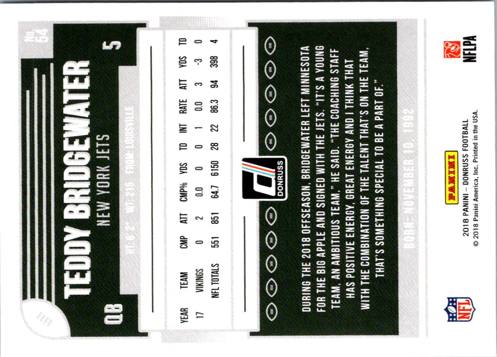 This 2018 Donruss Teddy Bridgewater #54 New York Jets card is an exciting addition to any sports fan's collection! Showcasing Bridgewater's iconic Jets uniform, this card features a crisp, vibrant image of the veteran quarterback. The card also has a full-color action photo of Bridgewater in the background, making it a must-have for any Jets fan. With Bridgewater expected to start for the Jets this season, this card is sure to become a collector's item over time. Add this card to your collection today and show your support for the Jets and their star quarterback!