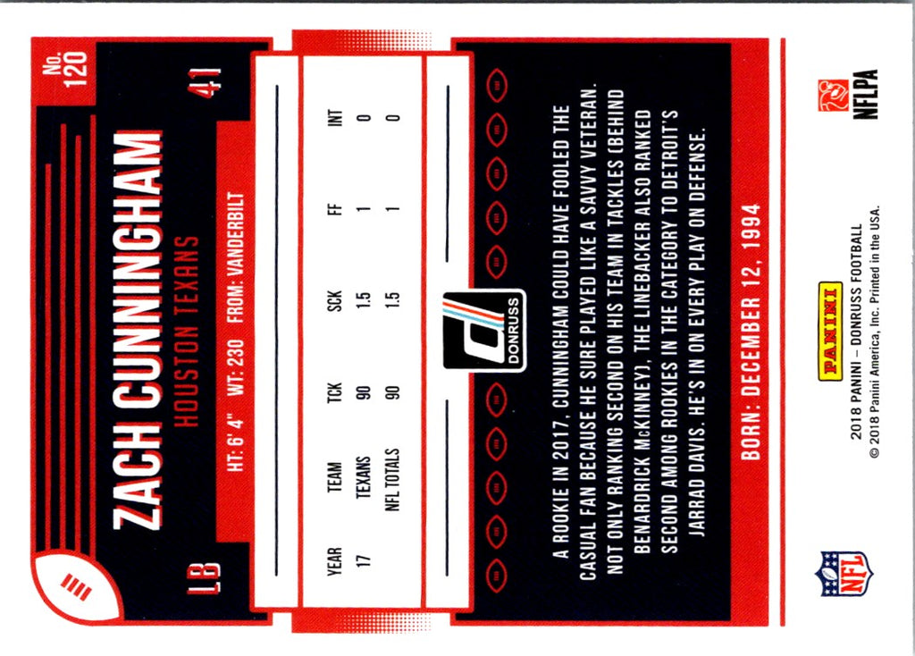 This 2018 Donruss Zach Cunningham #120Houston Texans card is a must-have for any serious collector. It features a vibrant, full-bleed action photo of Cunningham in his Texans uniform, and the textured card back features a detailed player profile. With sharp corners and an exclusive Donruss design, this card is sure to look great in any collection. Get your hands on this card and represent Houston's own Zach Cunningham!