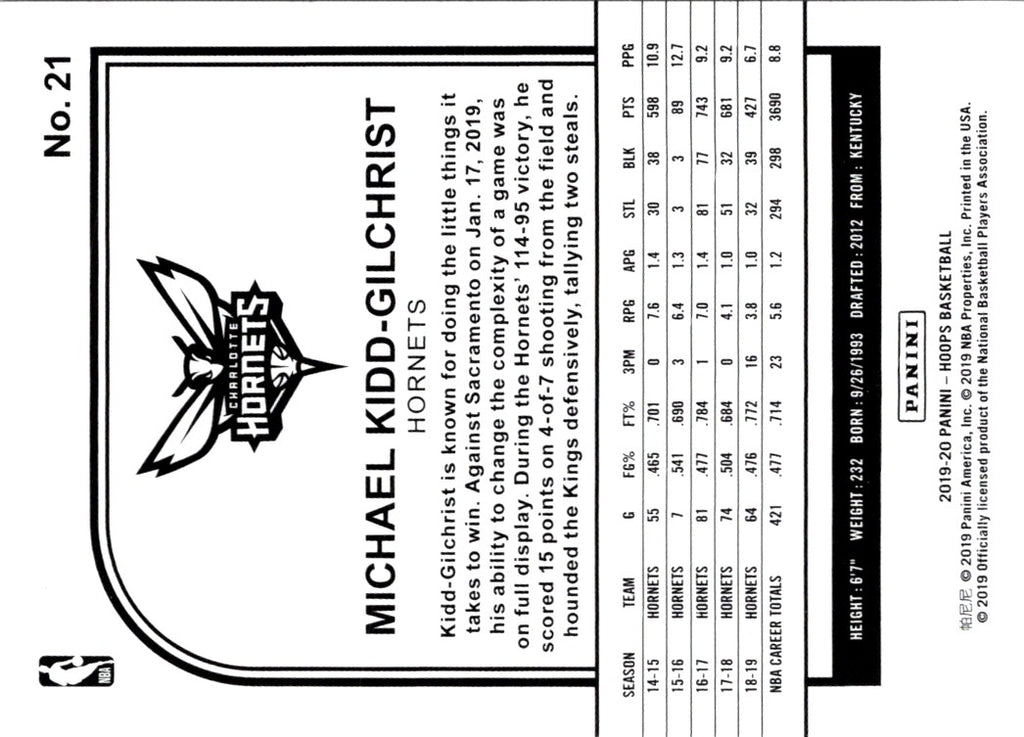 This 2018 Panini Certified Michael Kidd-Gilchrist card #50 from the Charlotte Hornets is a great addition to any collection. Show off your love for one of the NBA's greats with this colorful card featuring a dynamic action shot of Kidd-Gilchrist in his Hornets uniform. The high-quality cardstock ensures long-term protection and preservation, and the vibrant colors will remain bright for years to come. Add this item to your collection and be proud of your team's star player!
