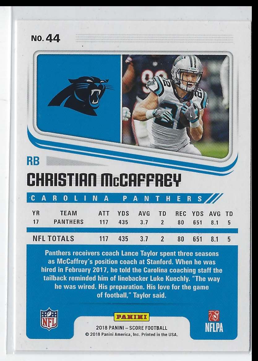 The 2018 Score Scorecard Christian McCaffrey #44 Carolina Panthers card is a great way to show your support for the Panthers and the amazing running back that is Christian McCaffrey. The card features a beautiful design, featuring Christian McCaffrey in action, with a full color background and team logo. The card also features vital stats, including height, weight, and position. It's sure to be a hit among Panthers fans, and a great way to show your team pride. Get your 2018 Score Scorecard Christian McCaffrey #44 Carolina Panthers card today!