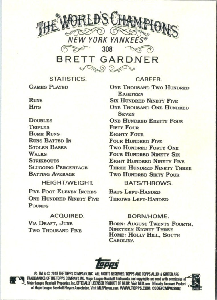 This 2018 Topps Allen & Ginter Brett Gardner #308 card of the New York Yankees is an absolute must have for any Yankees or Gardner fan! Featuring a full color image of Gardner in his signature batting stance, this card is sure to be a standout in any collection. Each card is printed on high quality stock, and highlights Gardner's career achievements printed directly on the back. Don't miss out on this incredible card of one of the Yankees' most beloved players!