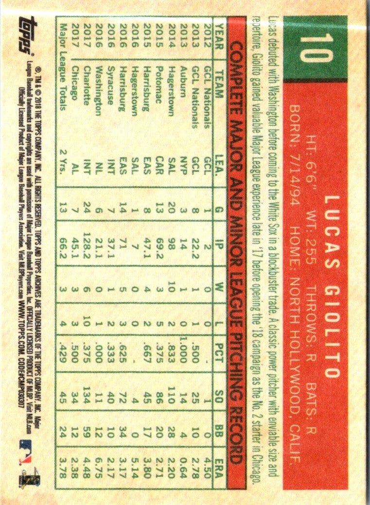 Relive the excitement of the 2018 baseball season with the 2018 Topps Archives Lucas Giolito #10 Chicago White Sox card! This card features a unique, modern design that celebrates Giolito's phenomenal performance throughout the season. The detailed images and stats on the card make it a great collectible for any White Sox fan. Add this card to your collection and show your support for Giolito and the White Sox!