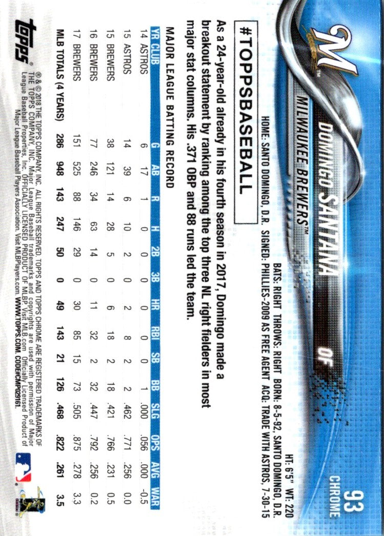 The 2018 Topps Chrome Domingo Santana #93 card captures the outfielder in his Milwaukee Brewers uniform. Featuring a glossy chrome finish, this card is sure to stand out amongst any collection. The vibrant colors and detailed imagery make it a must-have for any fan of the Brewers. The card also features a reverse negative image for a unique look. This card is perfect for any fan looking to add a unique piece to their collection. Add this card to your collection today and show your support for the Milwaukee Brewers.
