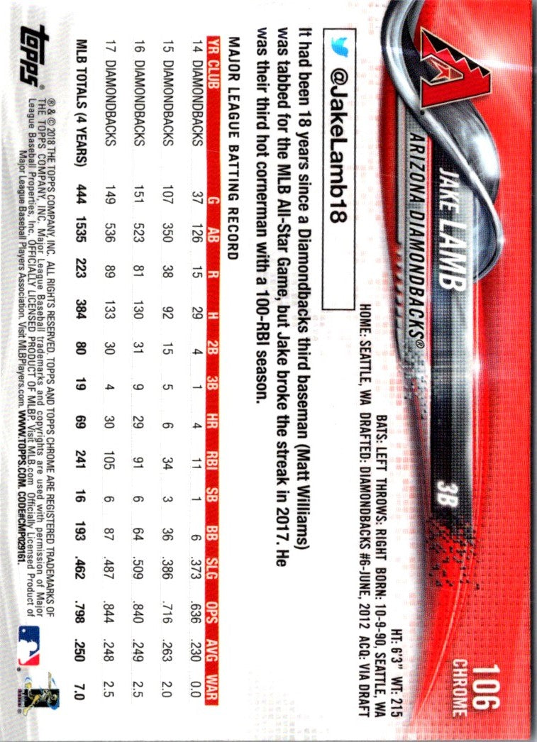 This 2018 Topps Chrome Jake Lamb #106 Arizona Diamondbacks card is the perfect addition to any Diamondbacks fan's collection. Featuring a full-color, glossy image of Lamb in his Diamondbacks gear, this card captures the player's unique style and athleticism. The card's design is enhanced with vibrant colors that make it stand out from the crowd. Jake Lamb is an integral part of the Diamondbacks' success and this card is an ideal way to show your support for the team. This card is a must-have for any serious Diamondbacks fan. Add this card to your collection today and celebrate the team's success!