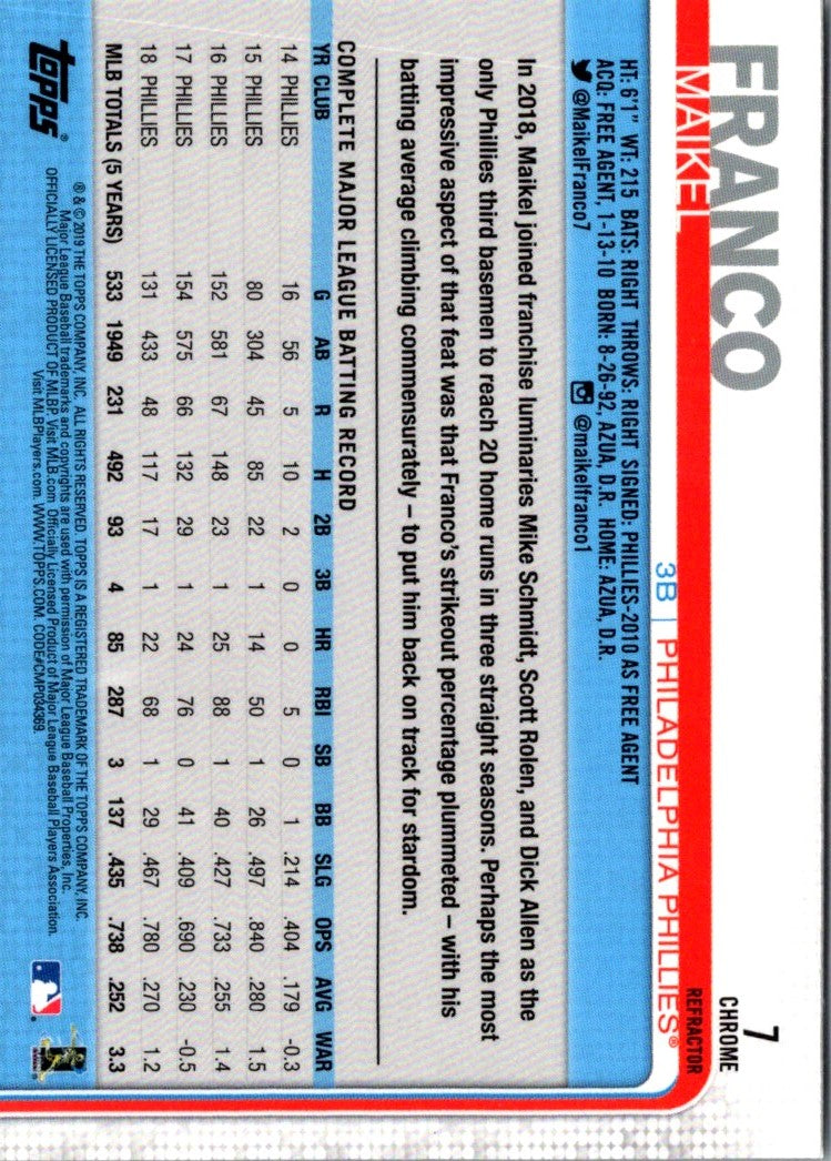 The 2018 Topps Chrome Philadelphia Phillies #339 card is a must-have for any Phillies fan. Featuring a vibrant blue and red team logo, this card is sure to add a unique touch to any collection. This card also includes a high-resolution photo of a Phillies player in action, making it a great way to commemorate your favorite team's successes. Collectors will appreciate the durable chrome finish, which ensures that this card will stand the test of time. Get your hands on this card today and show your support for the Philadelphia Phillies!