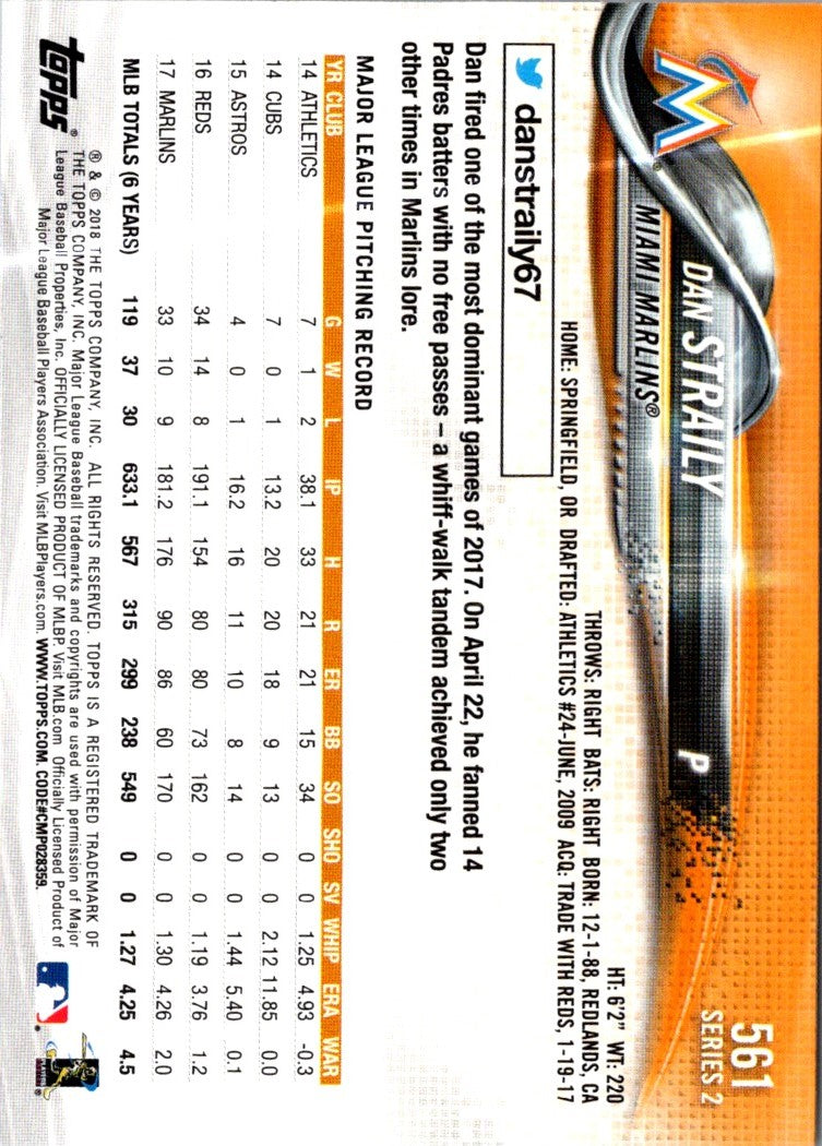 Introducing the 2018 Topps Dan Straily #561Miami Marlins card, a must-have for any Marlins fan or collector. This card features a classic image of Straily in his Marlins uniform and is printed on high-quality cardboard. With a great design and premium print quality, this card is sure to be an eye-catching addition to any collection. Add this card to your collection and celebrate one of the Marlins' most beloved players.