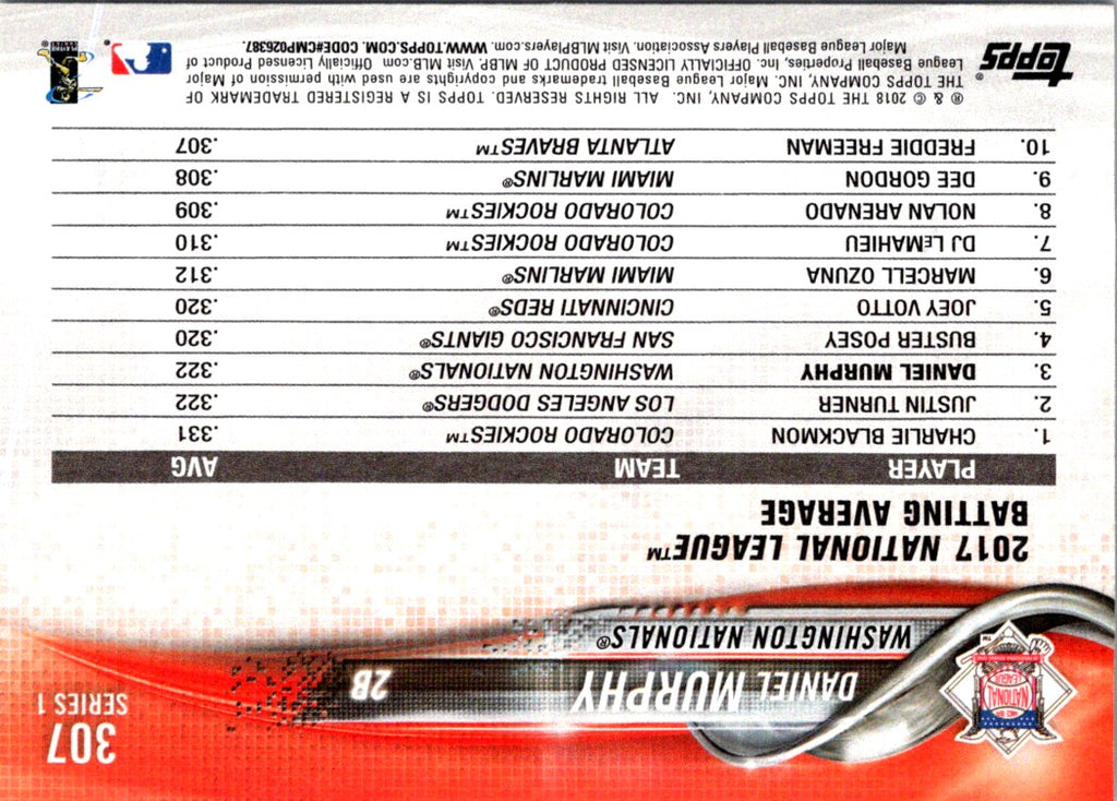 2018 Topps Daniel Murphy #307 Washington Nationals card is a must-have for any baseball fan. This card features a high-quality photo of Murphy as he steps up to the plate, with his iconic batting stance. It also features a detailed biography of the player, along with his career stats. This card is a great addition to any collection and is sure to be a conversation starter. Celebrate one of the most beloved players in the game with the 2018 Topps Daniel Murphy #307 Washington Nationals card!