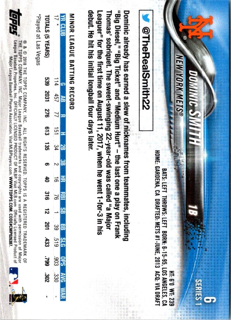 This 2018 Topps Dominic Smith #6 New York Mets card is an absolute must-have for any serious Mets fan. Show off your love for the Mets with this card featuring Smith in a classic Mets uniform. This card captures the amazing athleticism Smith brings to the game and makes a great addition to any collection. With vibrant colors and a glossy finish, this card is perfect for displaying in any fan's man-cave. Show off your Mets pride with this awesome 2018 Topps Dominic Smith #6 New York Mets card!